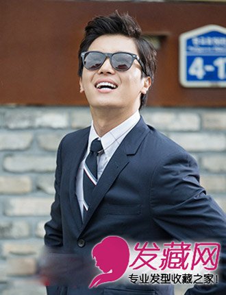 阳光灿烂的笑容,酷拽的发型,刘海往上翘起,充满型男范,黑色西装,墨镜,很酷。