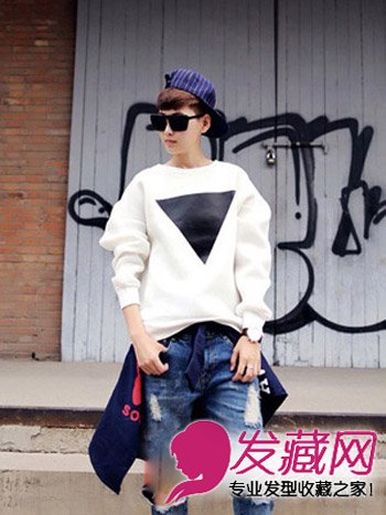 这款男生短发发型,头发颜色染成了时尚的红棕色,突显了时尚潮男的风范,个性的帽子,时尚感很强的墨镜,类似于乞丐服的穿着打扮,很有街头范呢。