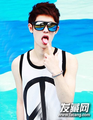 很显帅气风的一款阳光男孩造型,处于这个年龄段的男生可是最充满青春朝气的了,而这种简单的露额式造型配合略显蓬松的烫发与染发,一副简单的墨镜与运动型的衬衫更显青春活力风。