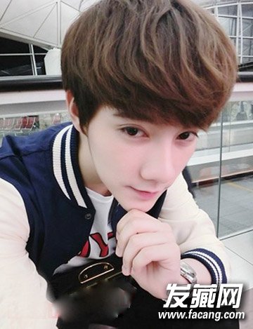 修颜的厚刘海发型依旧学弟们常见的清新发型,棕色染发更显的皮肤白嫩,头发烫出层次,可爱帅气,穿搭夹克休闲装,打造校草范。