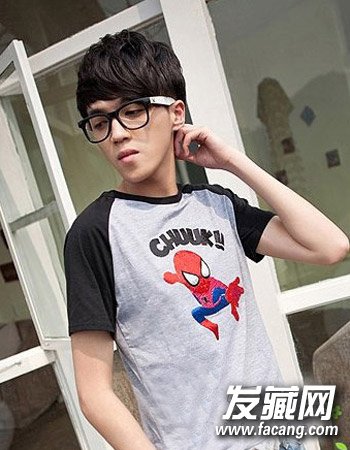 最后是一款很适合校园男生的眼镜造型,利用的是厚重的斜刘海纹理烫造型设计,而配合的简单清新的发色与一幅简单的眼镜相搭同样儒雅迷人。