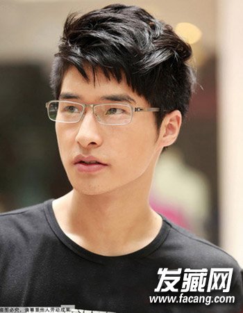 利用的是微显凌乱感的独特定位烫造型设计,再与清新自然的发色相搭,简单的碎发刘海与白框眼镜更添男生的文雅型男范儿哦。