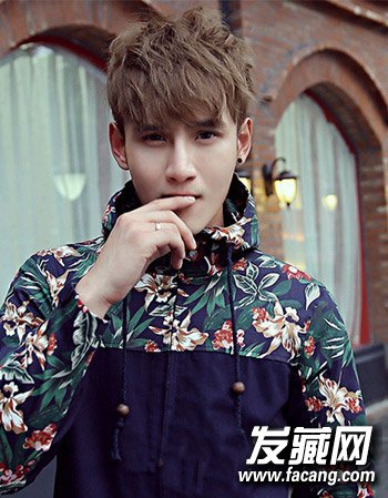 利用的是时尚的卡其色染发颜色,再搭配男生简单的齐刘海造型与时尚的纹理烫短发造型设计,潮流感十足中更添十足时尚帅气风。