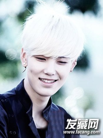 如果你是时尚尖锐的达人。那么这一款时尚的白色染色短发不妨尝试一下,帅气的斜刘海短发很适合长脸的男生哦。