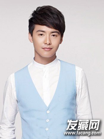 白色的衬衫,搭配浅色系的马甲,弄一头栗色系的斜刘海短发,微微露出些额头,刚毅的脸庞,突显十足职场型男style。