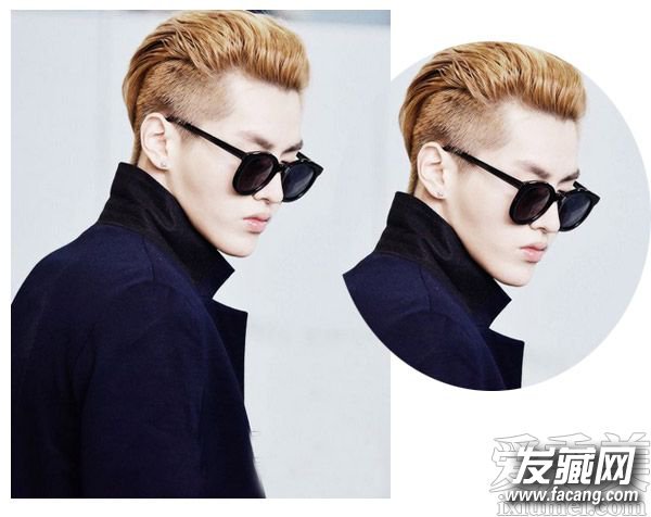 帅气时尚的背头与个性的染发颜色搭配起来,蓬松的造型与时尚墨镜勾勒出别致的时尚感来。