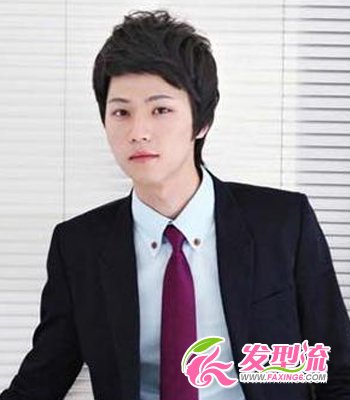 韩式烫发 典型的韩式风格,自然乌黑的秀发,头顶烫出蓬松厚重感,短齐刘海突显男生姣好的五官。搭配衬衣西装领带,散发出轻熟男的魅力,整体造型时尚帅气,非常适合职场男生。
