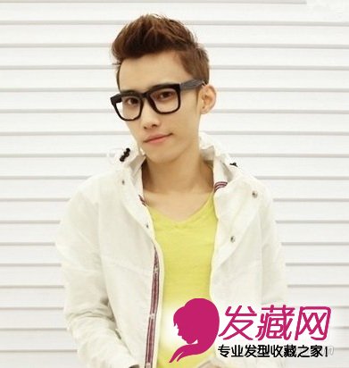 黄棕色染发颜色的这款韩式男发,带给我们阳光大男孩的感觉,很有运动活力的气息,短短的飞机头发型,中间部位向上竖直的打造,配上黑框大眼镜,非常阳光有活力。