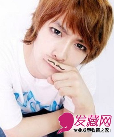 棕黄的染发色很显男生白皙的肌肤,碎长的纹理烫发很是呆萌帅气感,可爱的手指动作,给人感觉俏皮大男孩气息。
