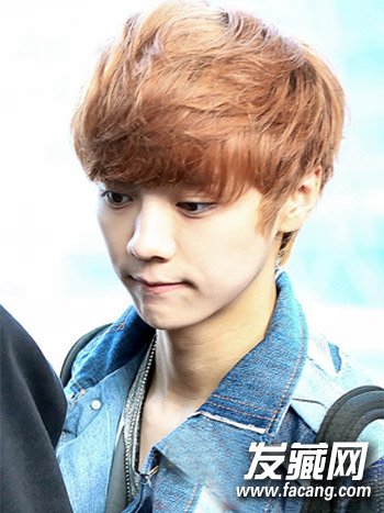非常减龄的一款韩式男生发型,适合发量多的男生打理的一款潮流发型,齐刘海修剪修饰脸型,时尚的染发令发丝很有质感,很有韩流范儿。