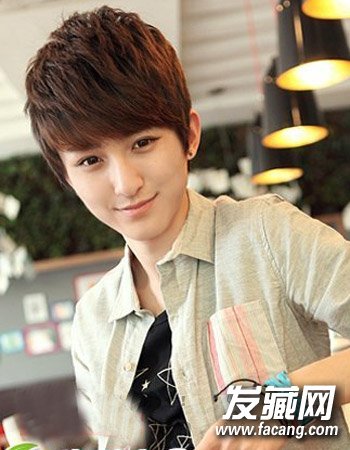 可爱的男生发型,帅气的斜庞克加上纹理烫发的处理不仅不会显脸小而且衬托出大气与时尚的一面,颇显清新校园风。