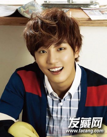 一款韩范十足的时尚男生烫发发型,微显凌乱感的蓬松定位烫选项与碎发形式的刘海相搭,而温暖的棕色染发更显小男生的帅气显阳光范儿。
