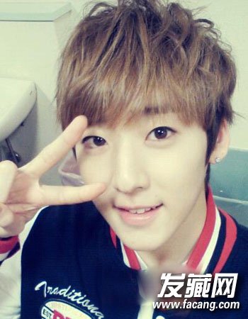很显小清新范的一款男生烫发发型,微微的定位烫造型设计与男生清新的棕色染发相搭将肤色衬托得更加的白皙,类似于空气感刘海的设计更是帅气吸睛。