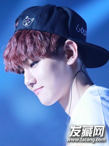 想要瘦脸的男生们必学的一款韩式男生烫发发型,蓬松的烫发修剪出层次,齐刘海短发搭配红棕色染发显肤白,搭配帽子个性十足。
