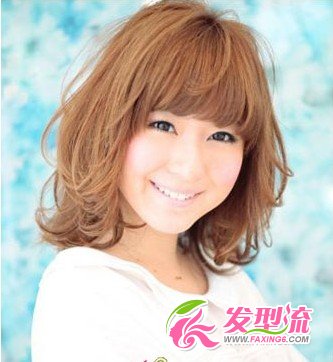 及肩的烫发发型展现出妩媚动人的气息,自然的发卷轻盈动感,和齐刘海呼应,打造出时尚俏皮的可爱气质。大大的眼睛和粉色系裸妆提升了这款中长发发型的气质。