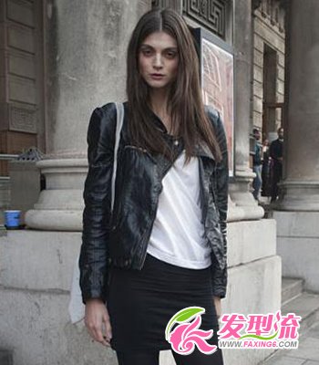 中长直发,长度恰到好处。发梢微微蓬松凌乱,时尚又不失自然。中分刘海很好地修饰了脸型,显得棱角分明,显露出几分娇媚。上身白色T外搭黑色皮衣,有种酷帅美,下身搭配包臀裙和黑丝袜,尽显诱惑美。