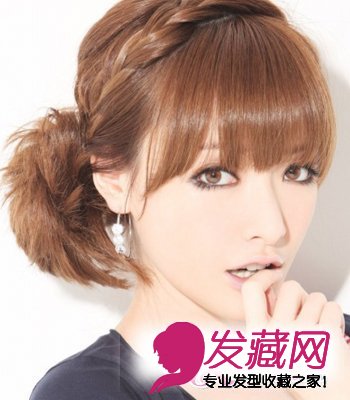 取左侧秀发编织出发辫再缠绕在额上,与后面扎起的发尾延结在一起,这样马尾扎发也不会显得太过单调。刘海可以掩饰光洁的额头,不会让人看起来过于突兀,从而透露了真实年龄,也是一款减龄式的发型哦!