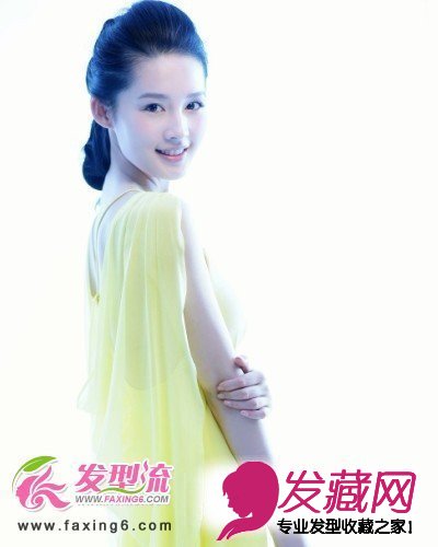 把额头的刘海全部梳起,干净利落,彰显清新气息,头后部, 有层次的将头发盘起,这种独特的发型设计巧妙的展现出立体的五官和完美的轮廓。