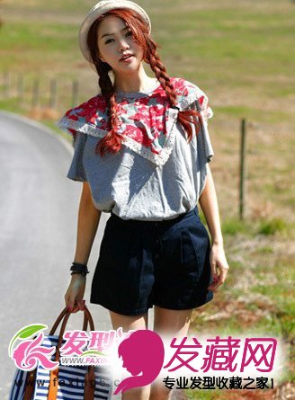 这款红棕色双麻花辫给人时尚阳光的感觉,一顶白色小帽遮住蓬松的头顶,左侧斜刘海半遮眉毛和眼睛给人娇羞的感觉,编好的麻花辫发梢有些许凌乱显得不呆板,整个阳光造型搭配休闲服饰和手里时尚包包,一个将要出门远行的少女形象瞬间打造出来了。