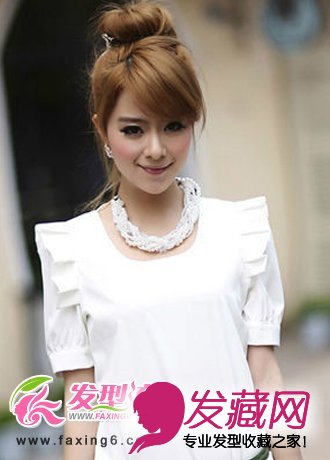 这款发型给人青春活力的感觉,栗色的染发添加了时尚气息,厚重的半月斜刘海很好遮住额头缩短了脸型,中长发发丝高高扎起挽成一个花苞形状,发梢收起用发夹固定好,高耸的花苞头盘发给人清新立体的感觉,个子稍矮的女生盘上这款发型还能增加自己的高度哦!