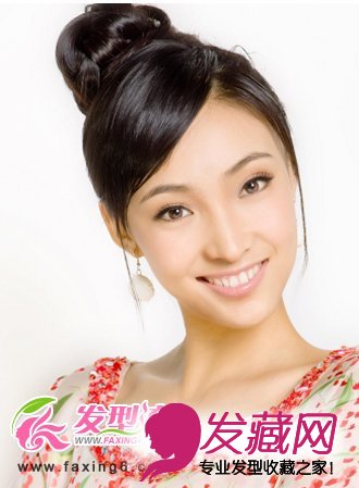 这款发型给人清新质朴的邻家女孩的感觉,二八分的斜刘海发型设计露出了漂亮的脸蛋,弯弯的眉毛仿佛会说话,甜美的笑容给人感觉亲近自然,高高耸起的花骨朵盘发增加了女生的高度,整个发型配上小碎花的服饰给人明媚朝气的感觉。