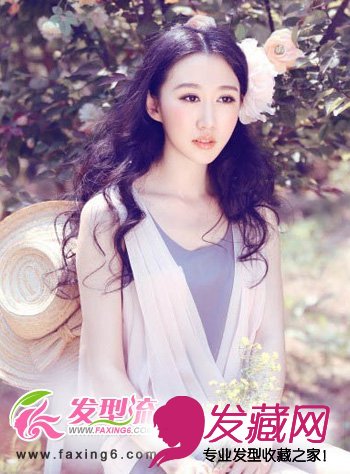 这款发型给人感觉优雅恬静,虚幻的背景添加了神秘色彩宛如一位天仙下凡的仙女静坐沉思,无刘海的发型设计很好凸显了精致的五官,粉色腮红衬托了女孩的娇羞,内卷外翘的发丝分散人们的视觉角度,左侧别上一朵大大的花饰很有民族特色。