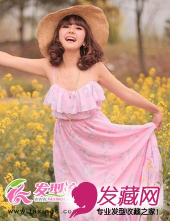 这款田园风的齐刘海发型设计很好遮住了双眉缩短了脸型给人可爱的感觉,深栗色的染发添加了时尚元素,内卷堆叠的发丝分为两侧垂落肩头,大边幅修饰的帽子遮住了蓬松的头顶,整个发型配上粉色系列的碎花裙一个清纯可人的形象瞬间产生在我们面前了。