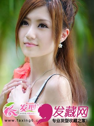 这款发型给人清新甜美的感觉,A字形的刘海发型设计与脸型搭配很完美,两边的鬓发很好修饰了大脸,发丝分为上下两部分,高高盘起上部分发丝打造出立体感觉,这款发型很适合淑女的MM们哦!
