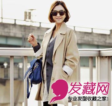 内扣短发发型,四六分刘海,打造干练的女生形象,肉色风衣搭配黑色打底裤,戴上墨镜一款,气质十分!