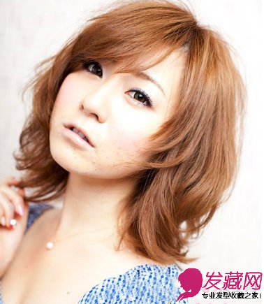 这是一款简单的碎发式发型,侧分的刘海十分迷人,两侧的发丝很好的修饰了脸型,加上金棕色的染发更是甜美时尚了,整个造型很有层次感,非常适合脸大的女生呢。
