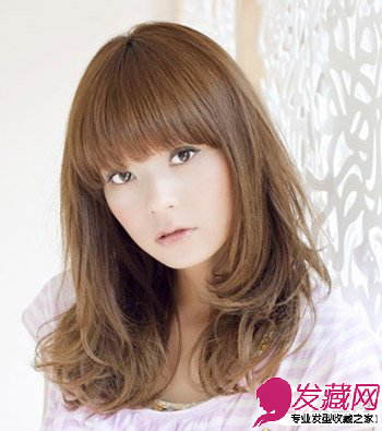 过眉的齐刘海微微内扣恰好修饰了过宽的额头,自然垂肩的中长发层次感非常明显,并打造出蓬松的感觉,棕色的染发显得小脸白皙透亮,非常动人。
