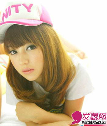 内扣的中长发加上到眼睑的齐刘海非常修脸减龄,棕黄的染发张扬个性,搭配粉嫩的棒球帽,更显清纯活力。