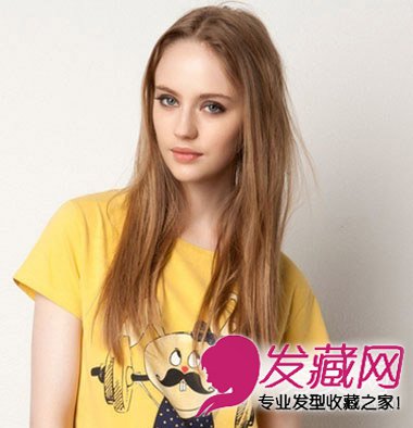 欧美校园女生最爱的气质中分长发发型浅金棕色的发丝彰显白嫩红润肤色,中分披肩发清纯可爱。