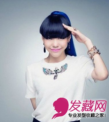 帅气的淡蓝色的长直发,整齐的高马尾扎法,厚厚的齐刘海设计,甜美可爱,清爽加分。