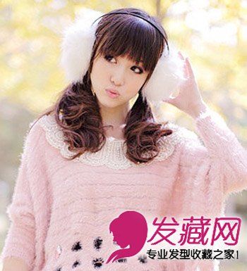 甜美的棉花卷发型,烫蓬感的发束扎两个马尾出来,暖暖的耳罩,粉嫩的毛衣,尽显萌少女气质。