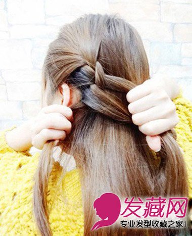 侧扎蜈蚣辫第四步:在第一条编子的下方同样编再编一条发辫,注意每次从旁边的头发取一些编到辫子里面去。
