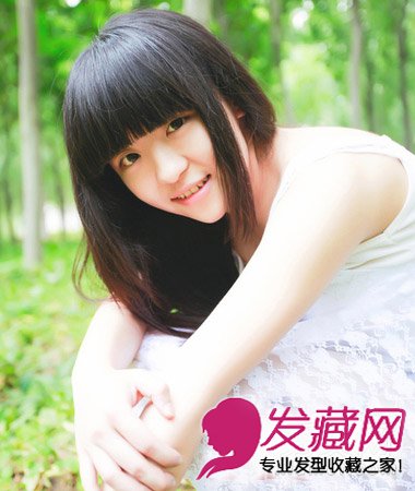齐刘海直发发型,修颜的圆弧状修剪的平刘海,乌黑发丝质感莹润美腻,非常瘦脸的一款直发发型。