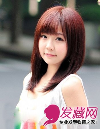 一款中长直发发型,唯美的齐刘海与圆圆的脸型搭配起来特别显小女生的气质,可爱又甜美,酒红色的发色更显时尚活力气质。