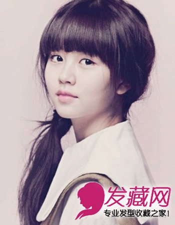 一款侧边扎发发型不仅显出别具一格的气文静感,而且厚重的齐刘海刻画出女生清丽又活泼的一面,很显小清新气质。