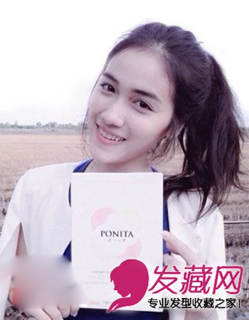 烫发马尾将整个造型打造出一种清新靓丽的感觉,无刘海发型更显清爽与时尚感,颇有校园女生的活泼与气质。
