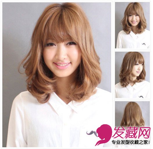 发型点评:这款中长发推荐给圆脸MM们。蓬松的内扣卷发将圆嘟嘟的脸蛋轻柔的包裹起来,大片刘海遮盖额头,可爱气质呼之欲出。