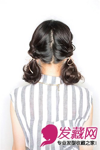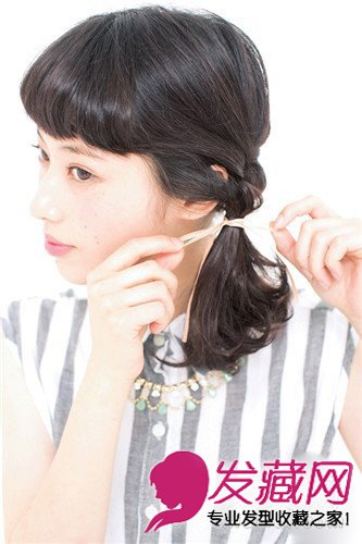 在发圈的结头上扎个蝴蝶结。最后用电烫棒只把发梢向外卷翘。