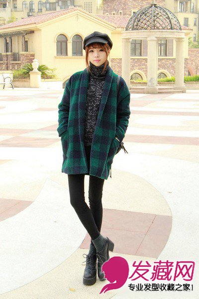 不同于传统的齐刘海,这款发型中两边留出的两缕长发增添了女性 的温柔气质,修颜更显脸小,打底裤加格子外套的搭配让身材看起来很显修长。