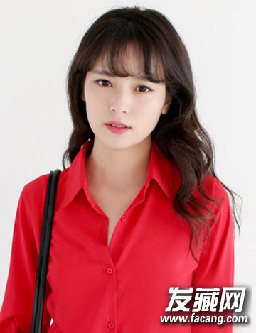 韩式的刘海发型绝对是圆脸姑娘的福音,显嫩瘦脸,简洁的OL中卷发,打出清爽层次,精致百搭,红色衬衫为春节增加了喜庆感。