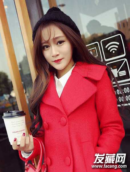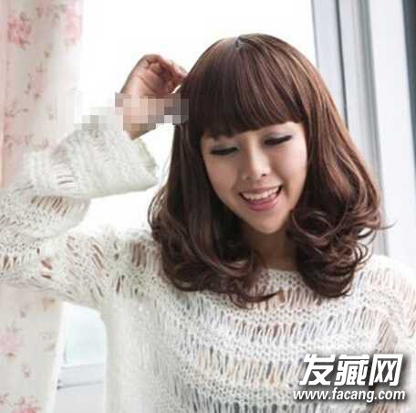 2、齐刘海是很多女生都爱的刘海类型,不仅修颜还显得特别可爱,发梢的中长微卷发配合蓬松感,给人一种全新的感觉。
