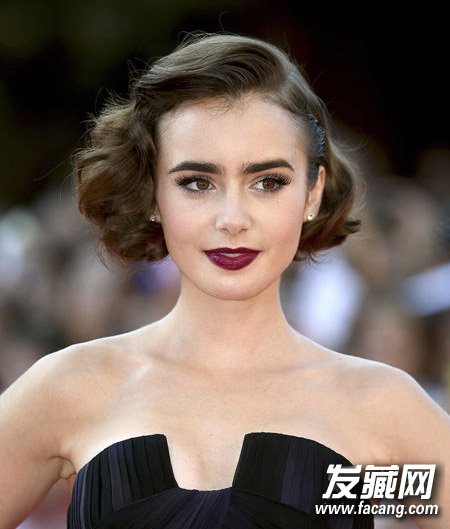不知不觉Lily Collins也加入了中长发行列,红毯上是用黑色礼服裙搭配黑色复古手推波浪卷和浆果色唇膏。