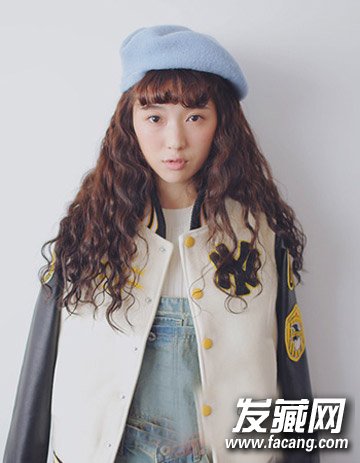 这种小波浪卷形式的长发发型可是最显小女生的活泼可爱感的了,而配合的清新自然的棕色染发与厚重的卷发齐刘海更是修颜显气质。