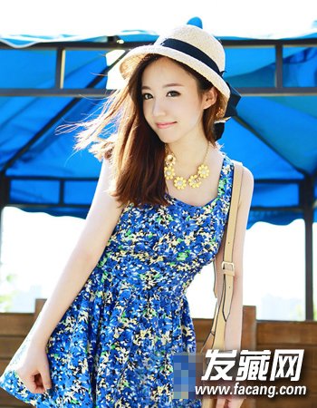 同样是侧边式的中长直发发型,不过因这款发型采用了时尚的中分设计会更显女神气质感,配合一身碎花连衣裙与米白色的休闲帽凸显的田园风格更是迷人。