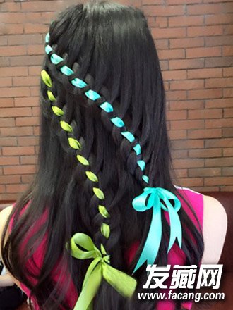 小清新偏爱的一款简单韩式长直发编发,长发在侧边编双侧瀑布辫,融入亮色发带的编发造型更添潮流,甜美的约会发型。