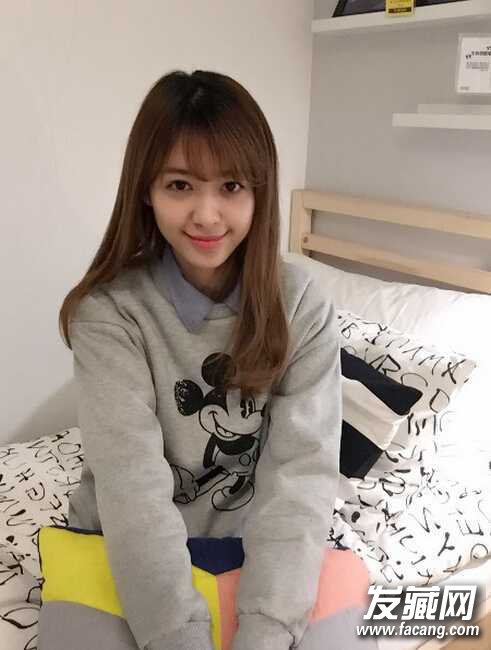 3、可爱又有小清新味道的中长发造型,碎斜空气刘海清新迷人,发梢处的小卷发自然又随性,随意染一个亚麻黄色也能凸显甜美味道。